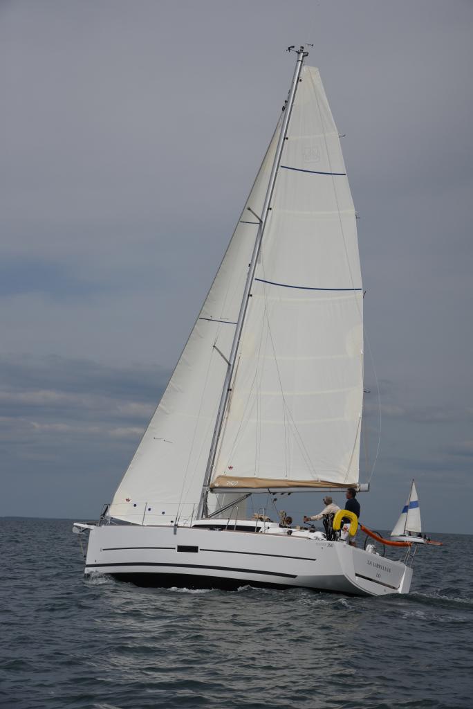 Ce bateau comporte l'option "grand prix" avec des voiles en DCX : génois de 34,5 m², GV de 34,5 m² soit une surface au près de 60 m², et un code 0 de 50 m² pour le petit temps.