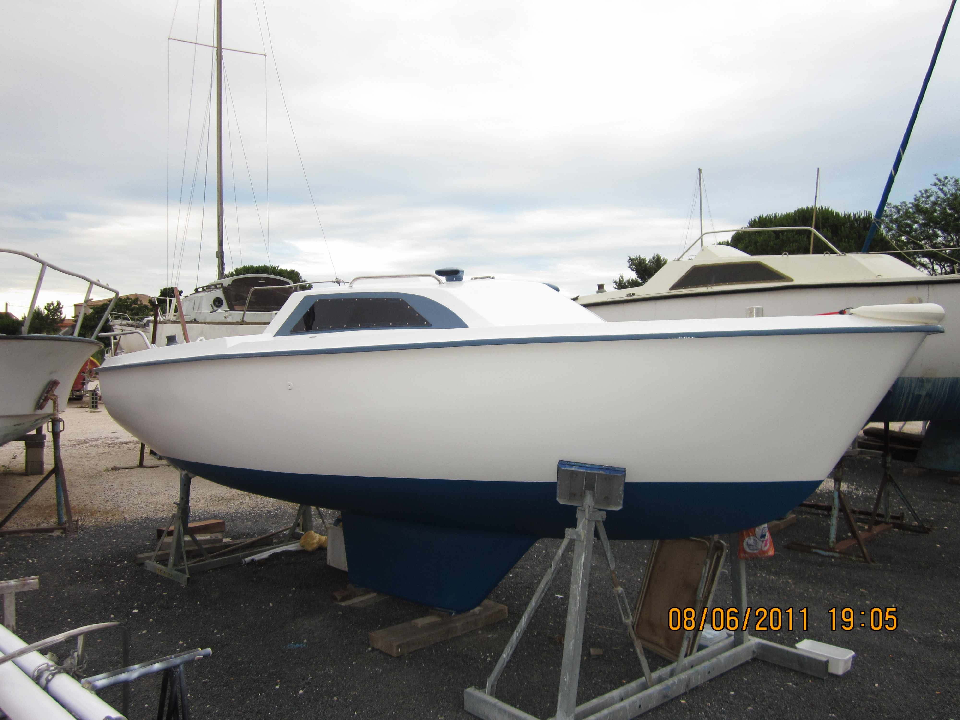 il a 4 couchettes et peut embarquer 6 personnes en navigation a la journée ce voilier léger de 600 kg n'a pas besoin de beaucoups de vent pour ce déplacer il avance 3 noeuds avec 5 km /h de vent et tient toute la toile jusqu'a force 3 et supporte la mer formée facilement force 5/6