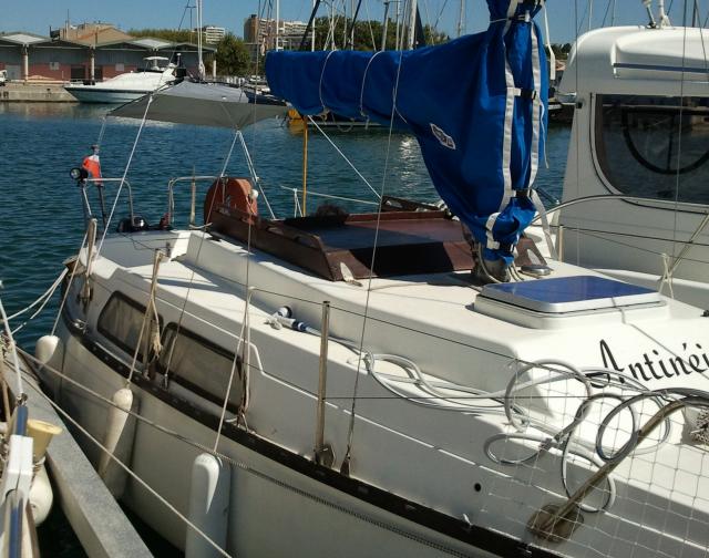 la hauteur sous barreau n'est pas vraiment gênante car le roof s'ouvre en grand sur quasi 1.5 m....bref très bon bateau et petit plus le notre avait encore son flettner de quille ( une merveille ce truc !) on a navigué à 2 et à 4 et à 6! (6 c'est une boite de sardine + les 2 chiens c'était très sérré!!! heureusement on avait de l'huile de bronzage pour glisser les uns entre les autres!!! lol